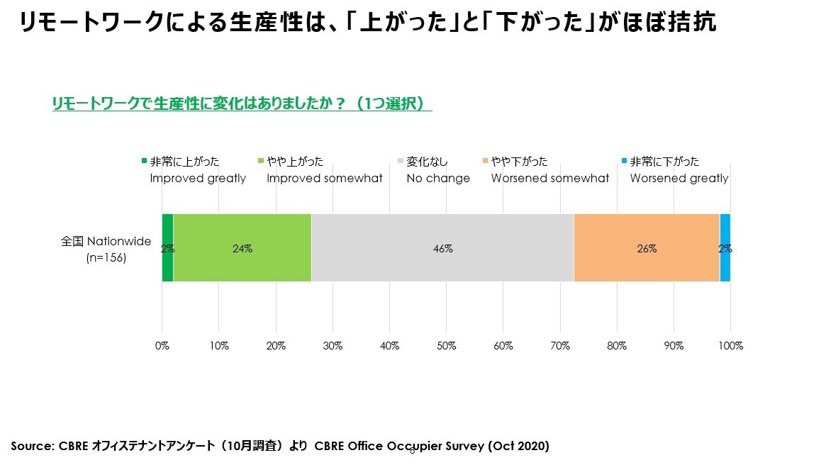 この結果を得た「CBRE オフィステナントアンケート」(2020年10月調査)では、リモートワークのメリット・デメリットについても尋ねていますが、「リモートワークで生産性は上がったか」という質問では、良し悪しの判断が拮抗する興味深いものになりました。