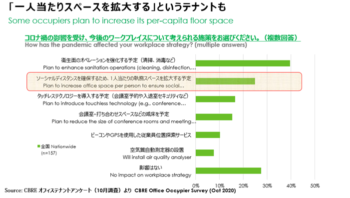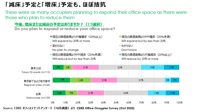 「規模の大きな企業がオフィスとして利用するいわゆる“グレードA”のオフィスビルは、5年間など長期の定期貸借契約が中心です。契約期間がまだ長く残っているのに、中途解約などの動きを取るのは逆にコストがかさんでしまいます。今経営陣は、売り上げが下がっているから固定費を減らすといった拙速な判断をするのではなく、コロナ禍で身をもって知ったソーシャルディスタンスなどを織り込んだ“ニューノーマル時代の働き方”を確立し、それを実現するために、トータルの床面積を増やすべきか減らすべきか、今後を見据えて戦略を練っているのだと思います」冒頭で触れた調査でも、今後のオフィスについて「増床」と「減床」が拮抗している様子がうかがえます。そうした企業が動きだすのはいつなのでしょうか。