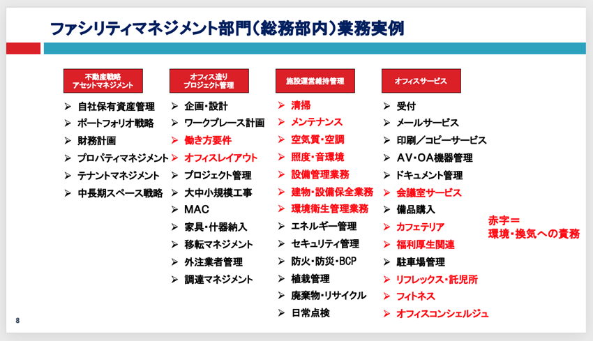 「施設管理やオフィス環境整備の観点に置き換えれば『空気質=換気』ということになりますが、総務やFM部門の業務と照らし合わせても、環境・換気への責務は意外とヘビーです。ましてや今のコロナ禍でメンバーシップ型雇用からジョブ型雇用への移行が加速しています。総務部門が全国に数十万あると言われている中、いまだ総務職の大多数が漠然と総務の仕事に従事しているのが実状です。これから総務のジョブ(ミッション)を今一度見直して、FM業務に特化した取り組みや働きかけが求められていくはずです」