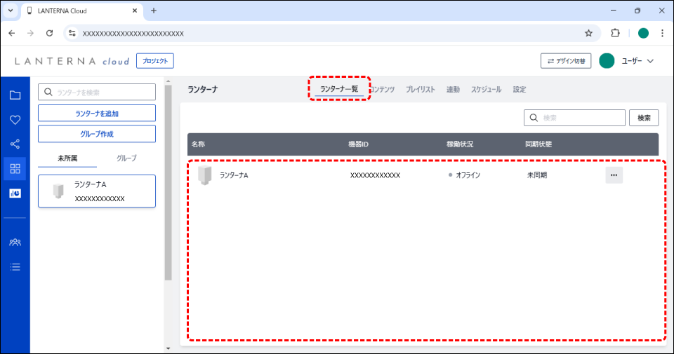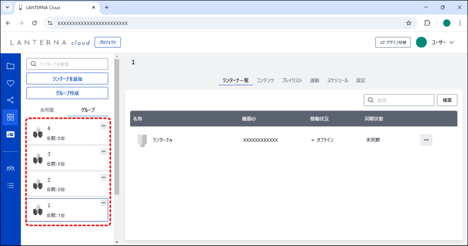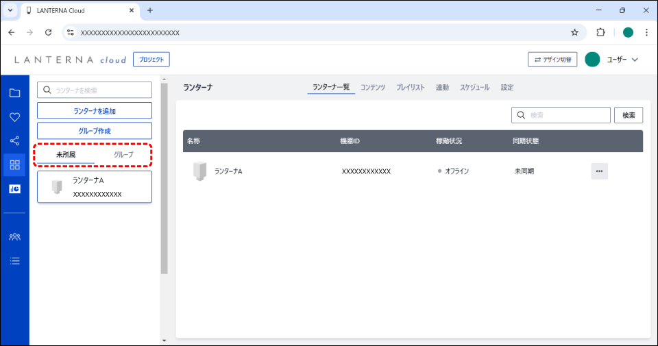 [グループ]または[未所属]をクリックすると、該当グループのランターナ本体がランターナ一覧に表示されます。