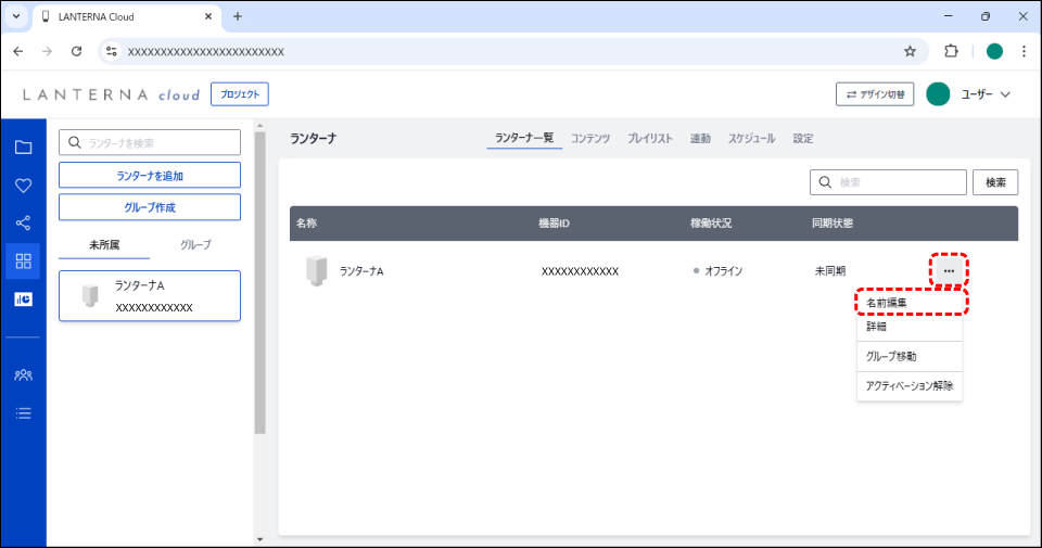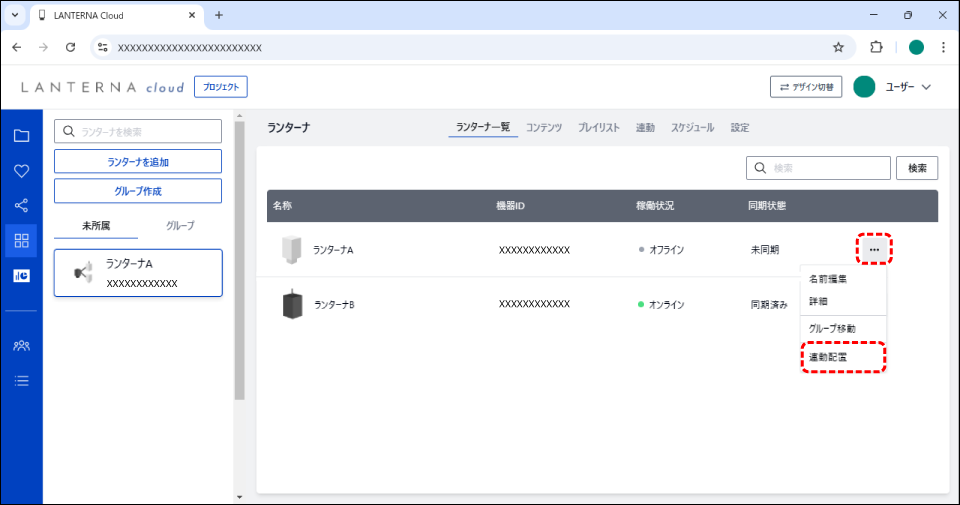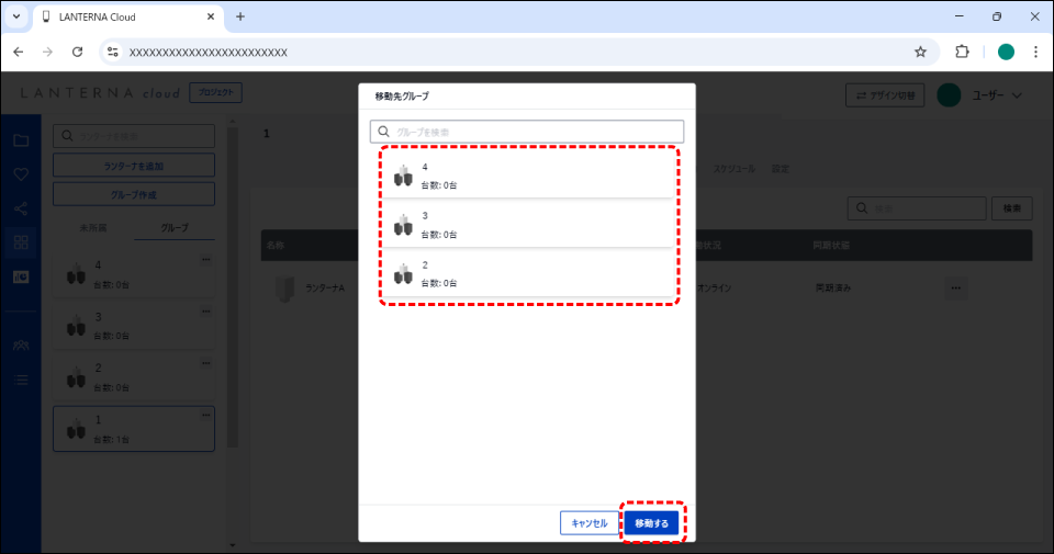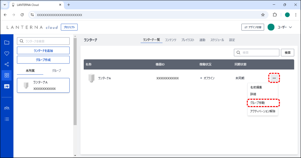 該当グループのランターナ本体がランターナ一覧に表示されます。 - グループ移動をしたいランターナ本体の[