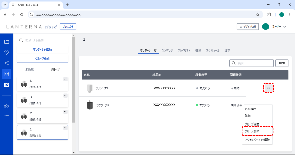 該当グループのランターナ本体がランターナ一覧に表示されます。 - グループ解除したいグループをクリックする。