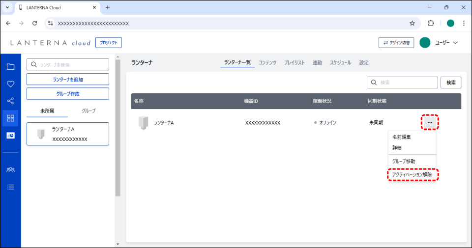 該当グループのランターナ本体がランターナ一覧に表示されます。 - アクティベーションを解除したいランターナ本体の[