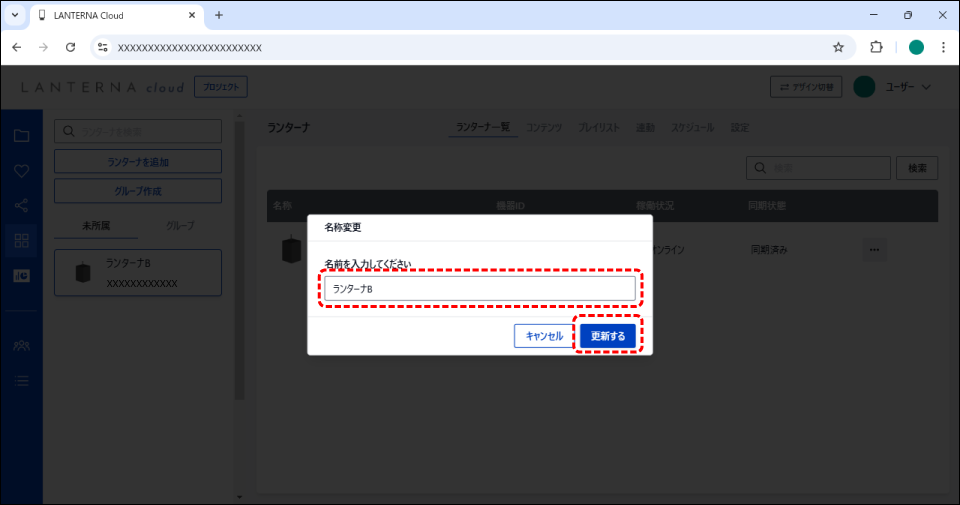 ランターナ一覧画面が表示されます。 - 名称変更したいランターナ本体の[