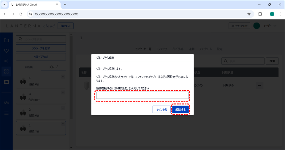 グループ解除が完了します。グループ解除されたランターナ本体は「未所属」に戻ります。同期されたコンテンツ・連動コンテンツ・スケジュールは全て削除されます。