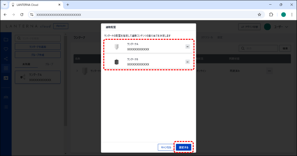 連動配置設定画面が表示されます。 - ランターナの配置を変更して[設定する]をクリックする。