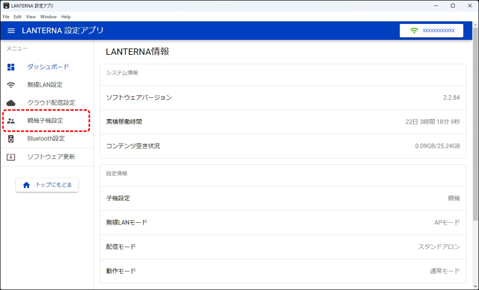 接続が確立され、ランターナのシステム情報画面が表示されます。 - [親機子機設定]をクリックする。