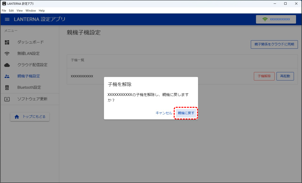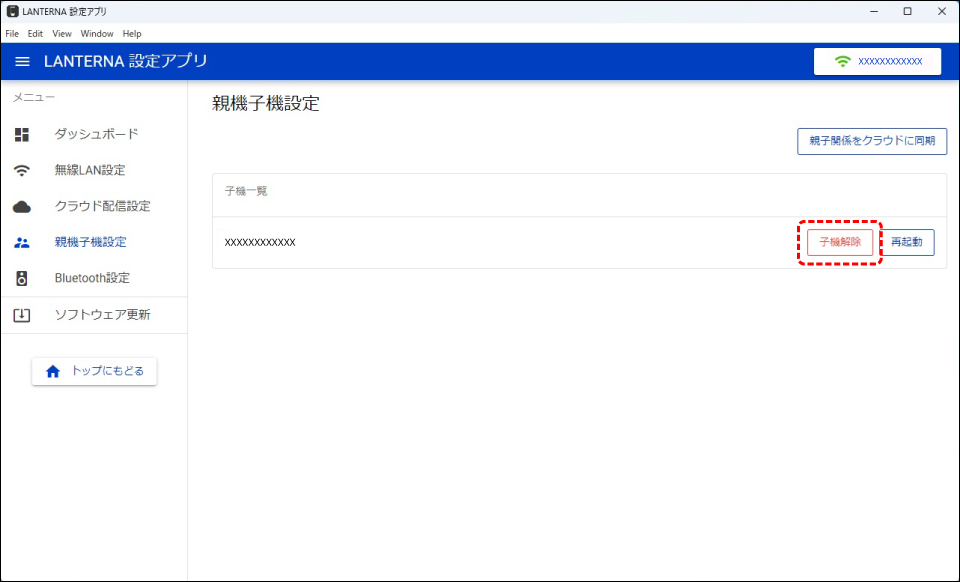 ランターナ本体が再起動し、親機に設定が変更されます。ランターナクラウド画面でも子機設定が解除されていることを確認してください。