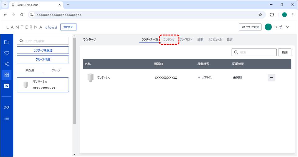 「コンテンツ」・「プレイリスト」・「連動コンテンツ」をランターナまたはランターナグループに配信するには、「ライブラリを管理する」・「プレイリストを管理する」・「連動コンテンツを管理する」のマニュアルをご覧ください。