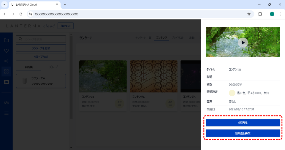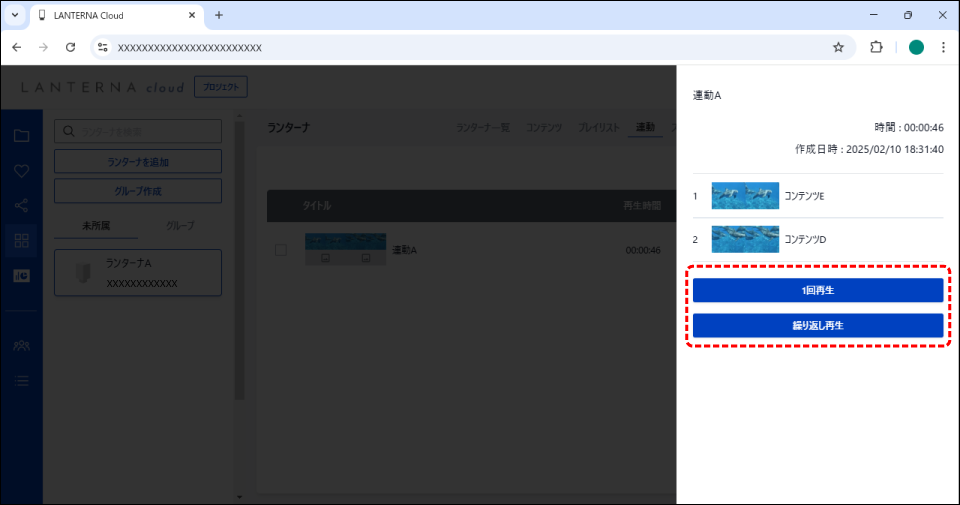 再生設定画面が表示されます。 - 即時再生させたい連動コンテンツを選択し、[1回再生]または[繰り返し再生]をクリックする。