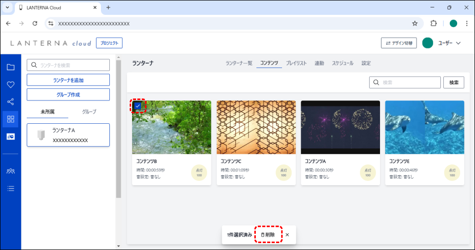 コンテンツ一覧画面が表示されます。 - 削除したいコンテンツの上にカーソルを合わせ、左上にチェックマークを付け、[削除]をクリックする。