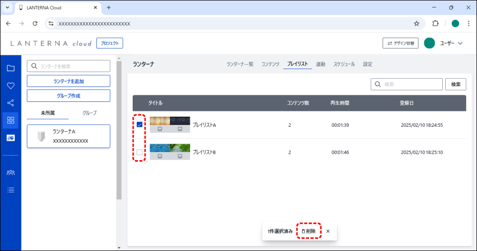 プレイリスト一覧画面が表示されます。 - 削除したいプレイリストの左側にチェックマークを付け、[削除]をクリックする。