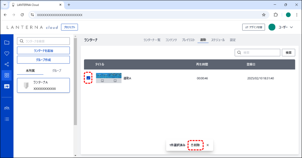 連動コンテンツ一覧画面が表示されます。 - 削除したい連動コンテンツの左側にチェックマークを付け、[削除]をクリックする。