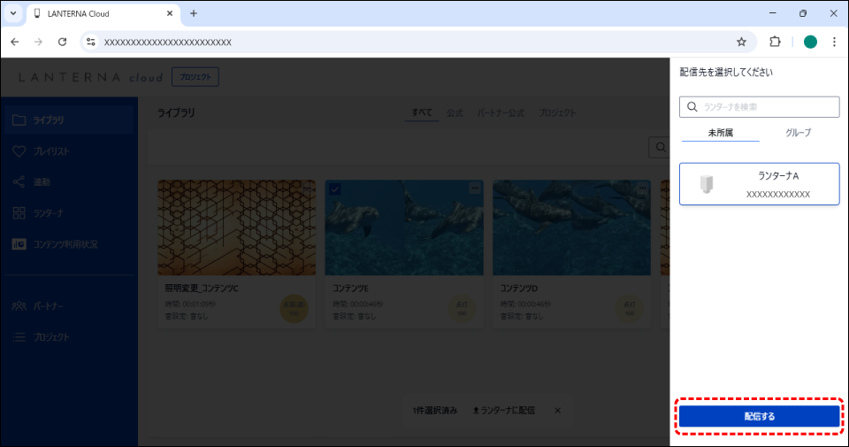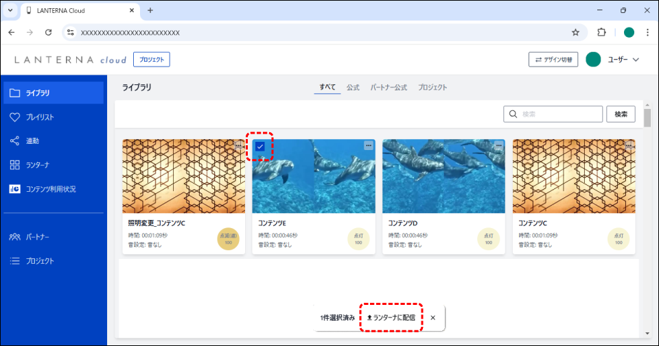 利用可能なコンテンツ一覧が表示されます。 - 配信したいコンテンツの上にカーソルを合わせ、左上にチェックマークを付け、[ランターナに配信]をクリックする。