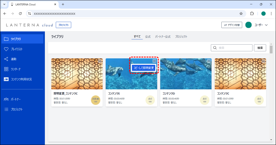 利用可能なコンテンツ一覧が表示されます。 - 照明変更したいコンテンツにマウスのカーソルを合わせ、右上表示される[