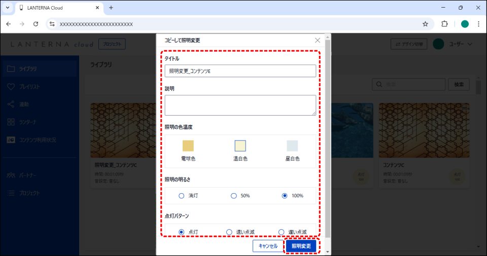 コピーして照明変更画面が表示されます。 - タイトル・説明・変更したい照明設定を選択し、[照明変更]をクリックする。