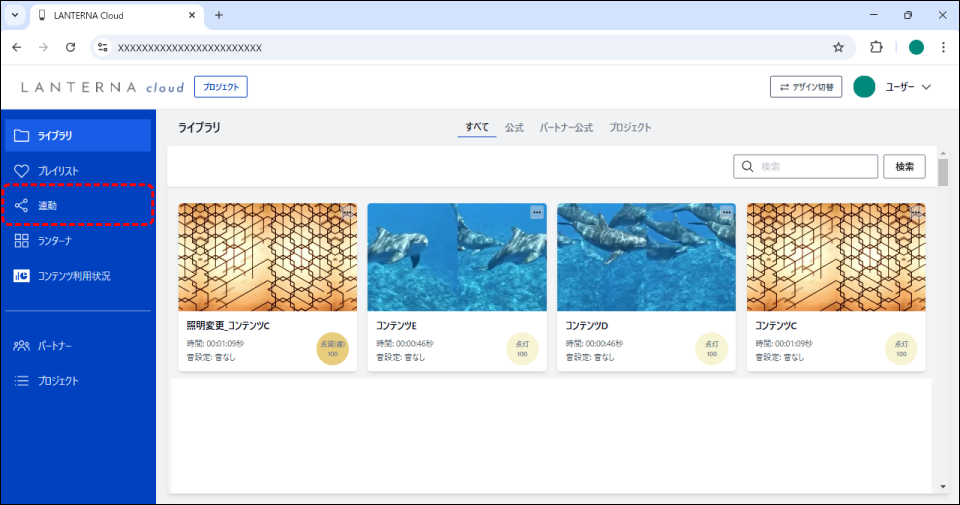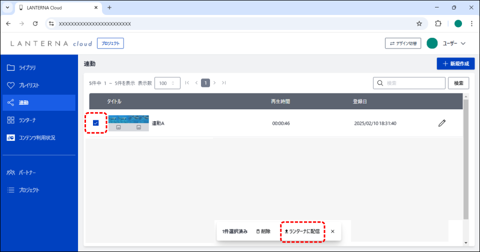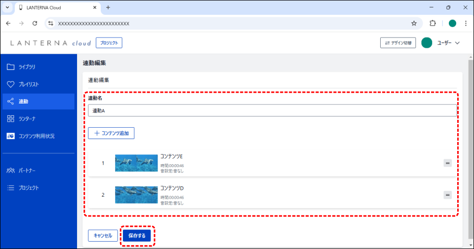 利用可能コンテンツやプレイリストから連動コンテンツの作成・編集・削除や、ランターナまたはランターナグループに配信することができます。