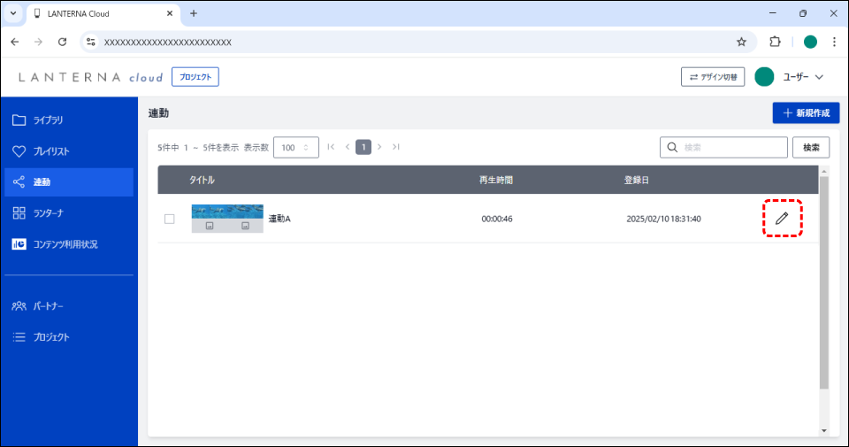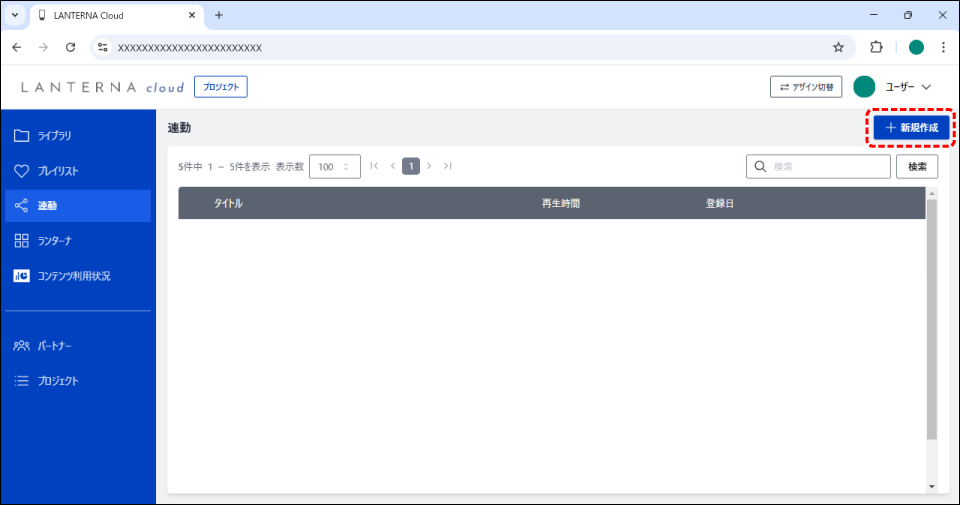 連動コンテンツ一覧画面が表示されます。 - [新規作成]をクリックする。