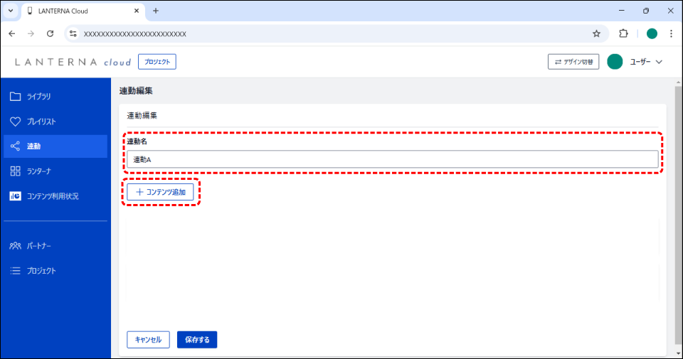 連動編集画面が表示されます。 - 連動名を入力し[コンテンツ追加]をクリックする。