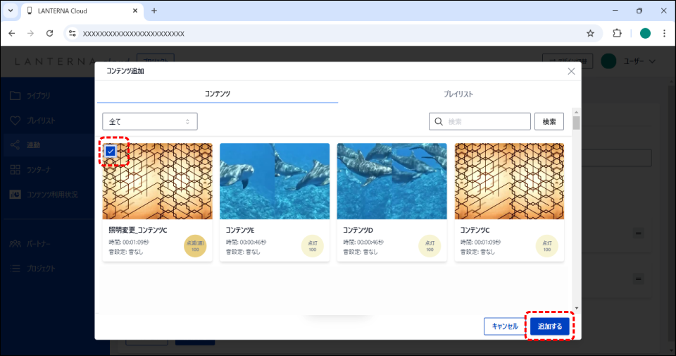 コンテンツ選択画面が表示されます。 - 連動コンテンツに追加する、コンテンツまたはプレイリストにチェックマークを付け、[追加する]をクリックする。