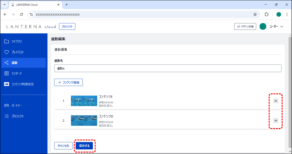 連動編集画面が表示されます。 - コンテンツの追加や削除、順番の入れ替えなどを行い、[保存する]をクリックする