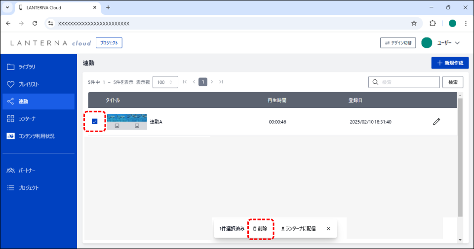 連動コンテンツ一覧画面が表示されます。 - 削除したい連動コンテンツにチェックマークを付け、[削除]をクリックする。