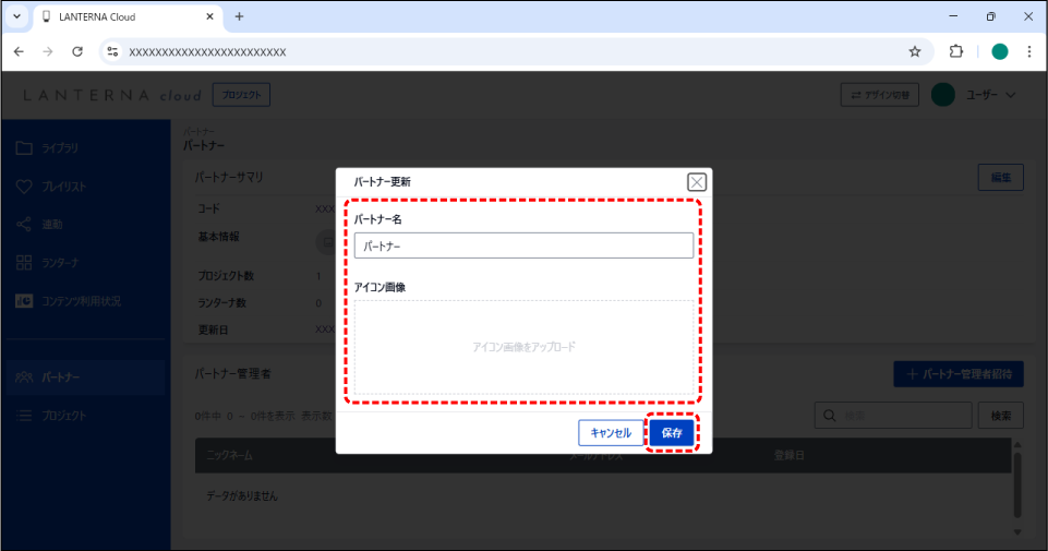 パートナー更新画面が表示されます。 - パートナー名を入力し、アイコン画像(任意)をアップロードをして[保存]をクリックする。