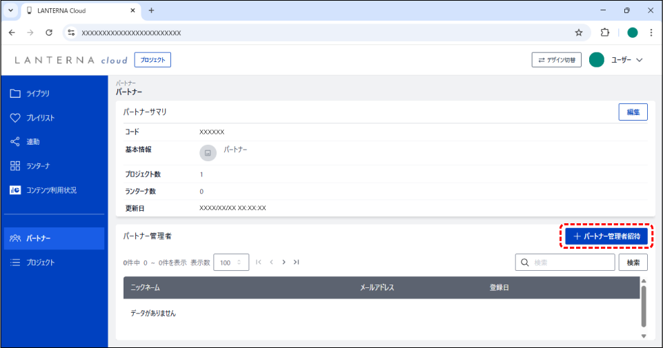 パートナー情報画面が表示されます。 - [パートナー管理者招待]をクリックする。