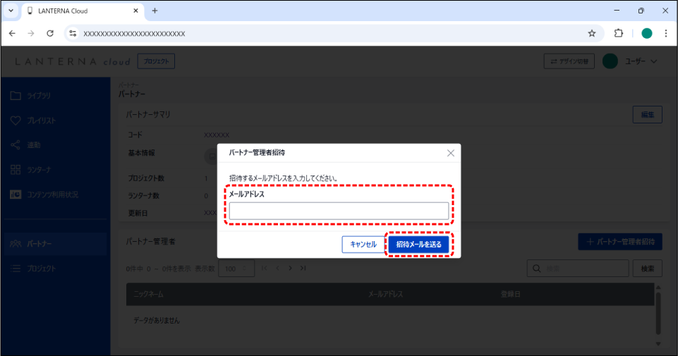 パートナー管理者招待画面が表示されます。 - 招待するパートナー管理者のメールアドレスを入力し[招待メールを送る]をクリックする。