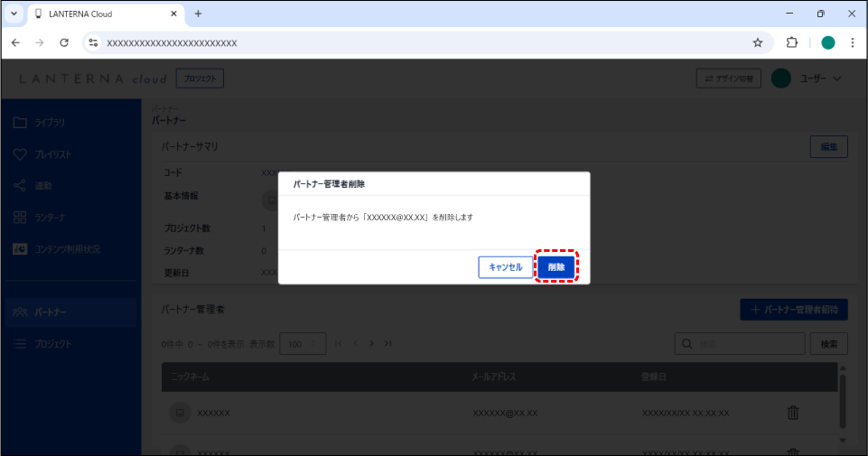 パートナー管理者削除確認画面が表示されます。- [削除]をクリックする。