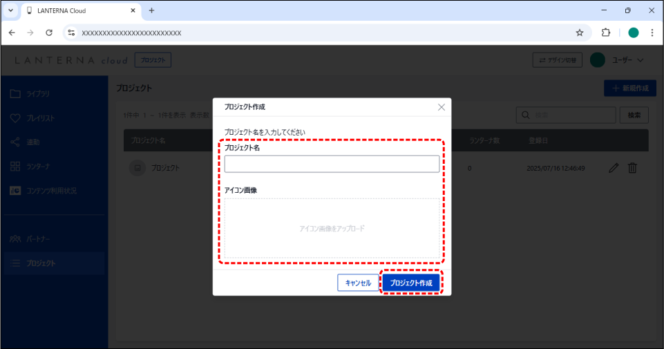プロジェクト作成画面が表示されます。 - プロジェクト名を入力し、アイコン画像(任意)をアップロードして[プロジェクト作成]をクリックする。