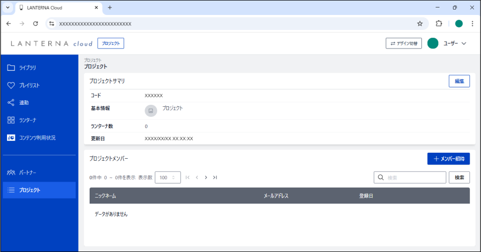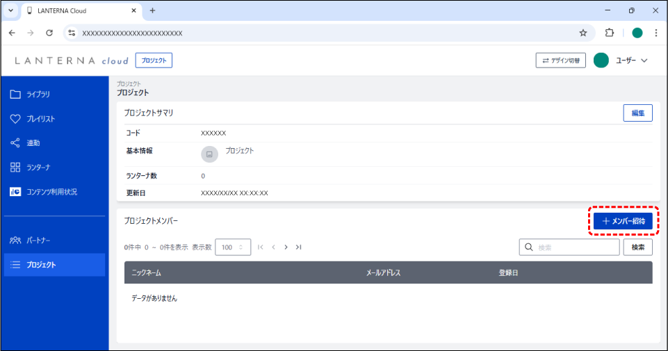 プロジェクトメンバー招待画面が表示されます。 - 招待するプロジェクトメンバーのメールアドレスを入力し[招待メールを送る]をクリックする。