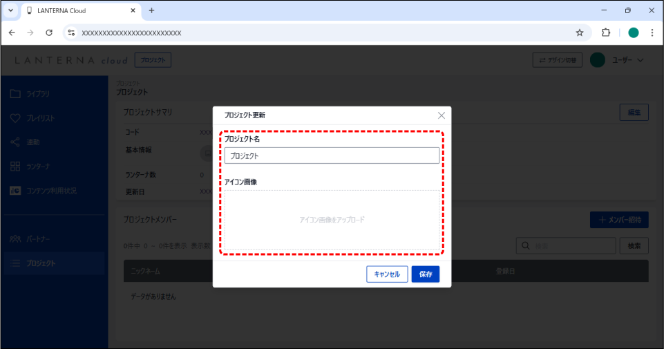 プロジェクト更新画面が表示されます。 - プロジェクト名を入力し、アイコン画像(任意)をアップロードして[保存]をクリックする。