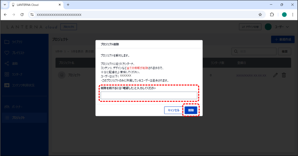 プロジェクトが削除確認画面が表示されます。- 「確認した」と入力し[削除]をクリックする。