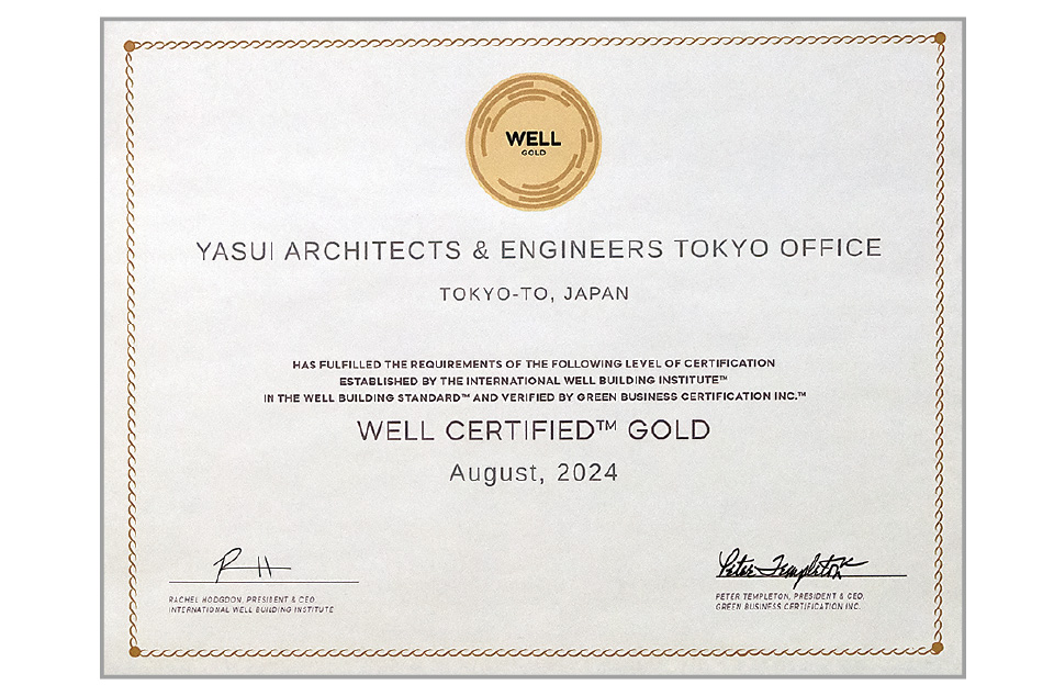 2024年、安井建築設計事務所は千代田区の平河町から、神田美土代町にある築後約60年のオフィスビルに東京事務所を移転し、「美土代クリエイティブ特区」と名付けた。ここは、これまでのオフィスと一線を画した、個性やクリエイティビティを存分に発揮できるような空間。社員や訪問者の快適性・心地良さ・集中・コミュニケーション・リラックスといった要素、さらに自主的イベントや活動の推進を重視したオフィスの環境づくりをめざして、WELL認証の取得が計画された。パナソニックは移転の基本設計段階から協力し、WELL認証の要素を基にしたゾーニングを提案。評価項目の「イノベーション」カテゴリーでは、従業員の自主活動である「オフィス自治会」や地域連携の「1階コミュニティスペースでの音楽会開催」など、特徴あるイノベーション項目で加点することにより、築60年を経たビルでありながら、WELLv2認証「ゴールド」を取得した。