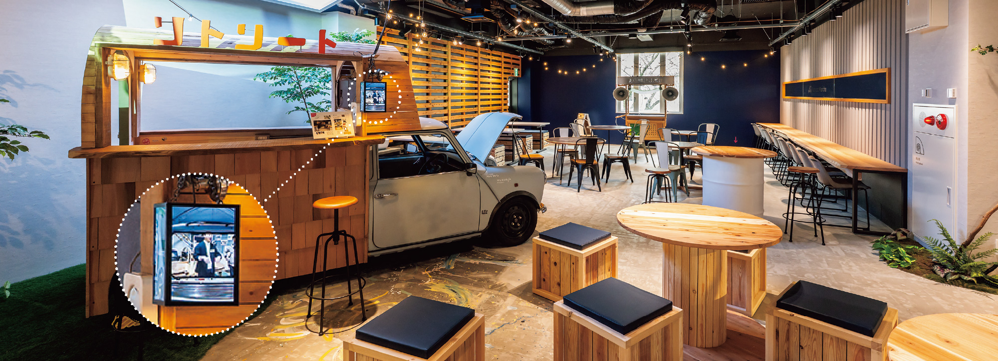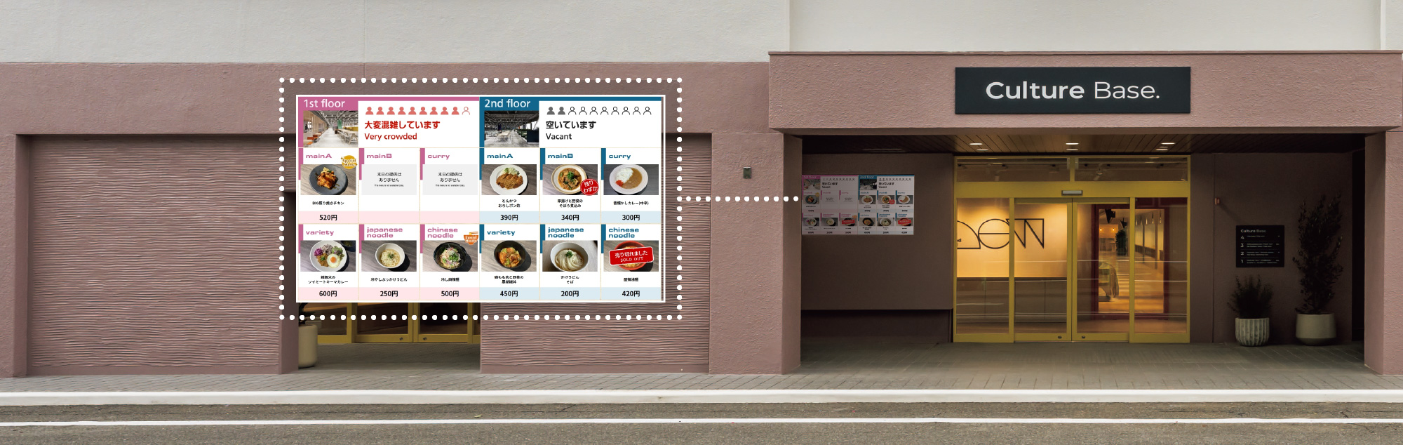 エレクトリックワークス社門真拠点の社員食堂でもある厚生会館が大規模改修により「Culture Base.」と名称を変更し、コンセプトも新たに生まれ変わった。門真拠点では敷地内に新施設の建設が続き、出社率の回復と併せて食堂の需要拡大が予想された。従来、1・2階の食堂には合計600席を超える飲食席があり、各階によって提供される食事メニューも異なっていた。このため、同時に大人数が利用する食堂入口では滞留や混雑が発生していた。これを改善するため、1階食堂入口に「空間見える化ソリューション」を用いたデジタルサイネージを設置。1階と2階で提供している食事メニューと合わせて座席の混雑度も表示している。これにより、入口での混雑を回避し、人を適切に誘導することで、ストレス無く料理を取り、席に着けるように計画されている。