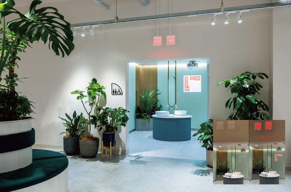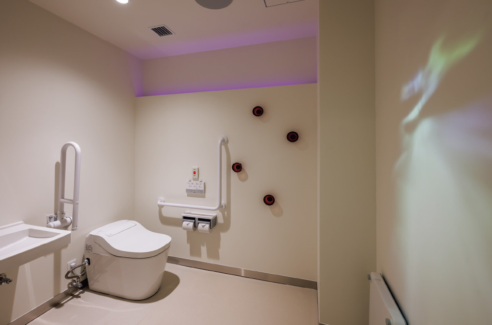 さらに、「Culture Base.」ではDEI視点を取り入れた空間設計が行われている。1階にジェンダーレストイレ「みんなのトイレ」、3階には特定の宗教に特化しないplayerroom(祈祷室)なども新設されている。1階の「みんなのトイレ」では、性別にとらわれることなく誰もが気兼ねなく利用しやすい空間デザインが採用され、それを実現するために、映像や「環境音ソリューション」による空間演出が行われている。