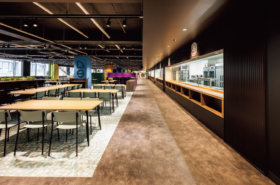 また、働き方の多様化により多目的な活用も増えてくると想定される。このため、1階では、食堂(座席数292席)に加えて30席の半屋外テラスも配置。2階食堂(座席数336席)では、昼食時以外はミーティングなどにも活用できるエリアを設け、売店と連携した「リトリートマルシェ」も新設されている。