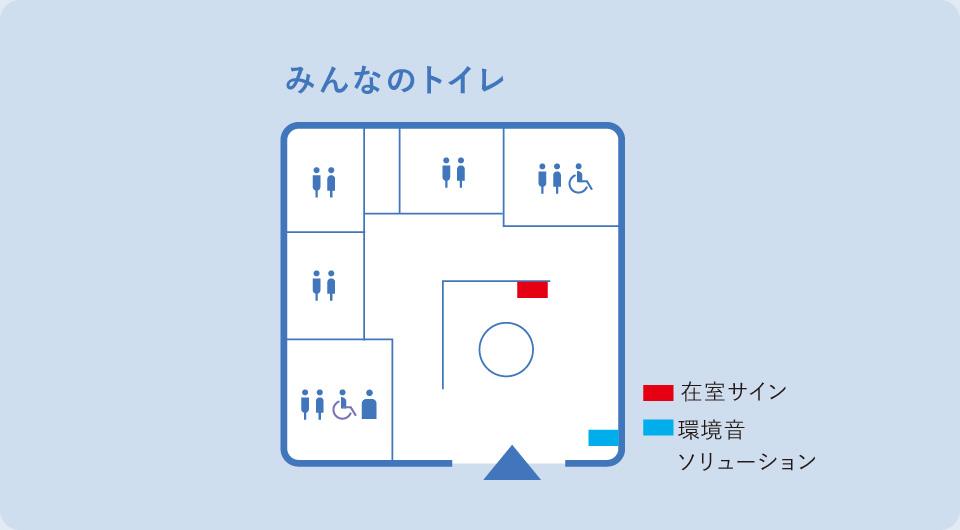 前田:設計のテーマは、使いやすさと居心地の良さを盛り込むことでした。その結果、食堂とトイレの中間部にシンボリックな洗面ホールを設置して食堂からの見た目や視線を遮断。洗面カウンターを中心に左右に分かれる回遊型レイアウトを採用しました。車イス利用者のためには多目的・多機能トイレを入口側に配置。性別にとらわれることなく誰もが気兼ねなく利用しやすい雰囲気を映像や「環境音ソリューション」によって演出しています。5つある個室は多機能トイレ、多目的トイレ、個室トイレで構成されており、それぞれ光と音で個性を持たせてDEIを表現。トイレ機能だけでなく、気軽に気分転換できる気持ちに寄り添うトイレになったと思います。