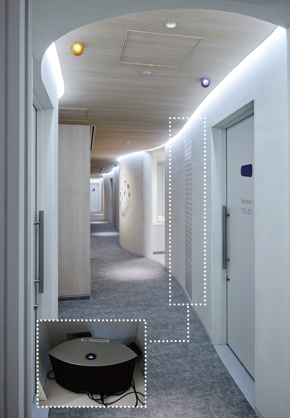 特徴的なのは、オフィスにおける新たなトイレの在り方に挑戦した15階の「SOMPO TOILET」。「豊かな発見に巡り合える、まち並みのようなトイレ」をコンセプトに、用途に合わせて8つの個室を計画。リラックスやチャイルドケア、フィッティングなどの多様な個室トイレが設置された。その中に導入されたのが、ハイレゾオーディオを用いた「環境音ソリューション」。トイレの音漏れ感を軽減すると同時に、心地良いサウンドスケープを実現しており、音源にはクリエーターの灰街令さんの作品が用いられている。