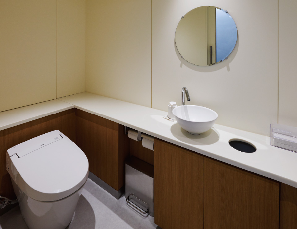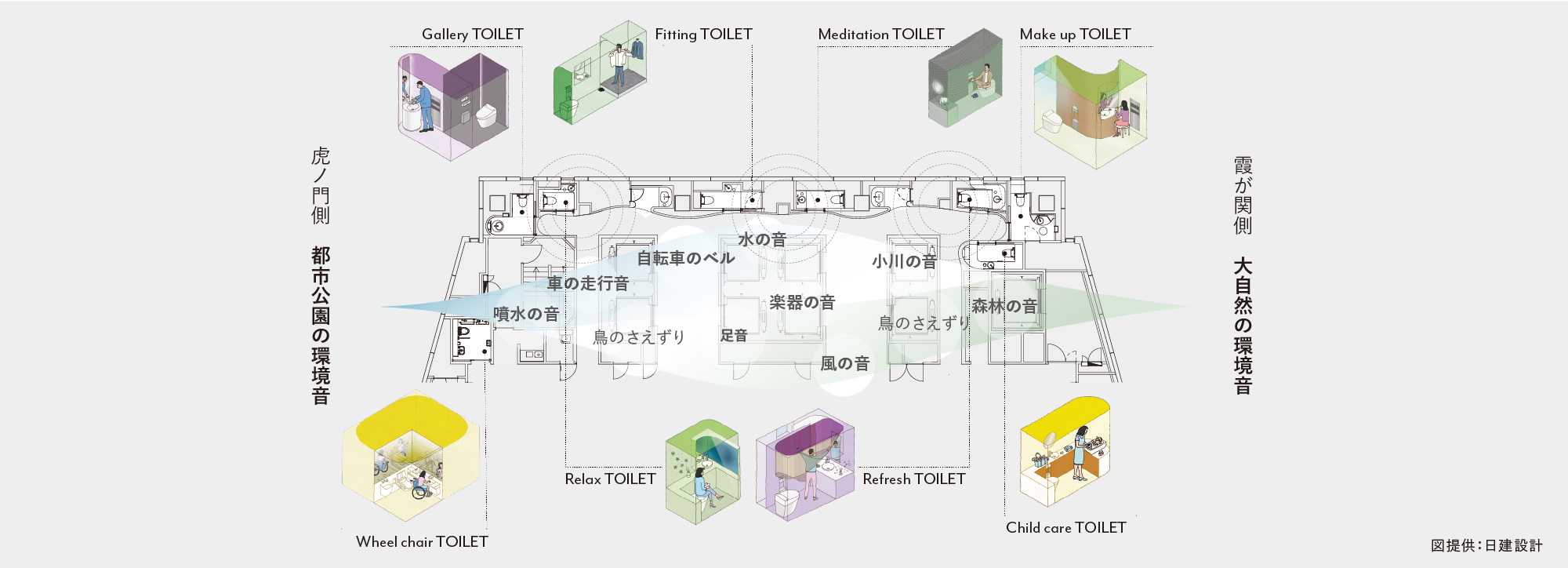 15階のトイレでは、課題が指摘されるジェンダーレストイレを発展させ、リラックスやチャイルドケア、フィッティングなど、目的に合わせて利用する個室を選べるオルタナティブトイレを作りました。その中に、使用音が聞こえないように「環境音ソリューション」を採用。使用音のマスキングだけでなく、霞ヶ関側と虎ノ門側では音源の雰囲気を変えており、使用する場所により異なるサウンドも好評です。