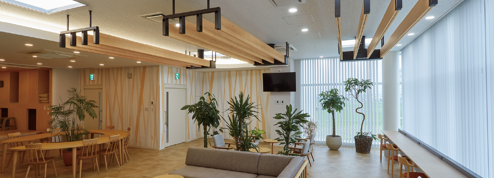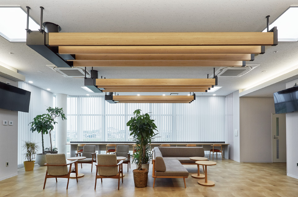 富山市北部地区の二次救急病院として、年間3,000人を超える救急搬送患者を受け入れ、緊急手術や血管内治療などの高度な医療にも対応し、地域医療での役割を果たしている富山県済生会富山病院。このたび、予防医学を充実させるために健康管理センターが増築され、2024年8月にオープンした。その4階フロア全体を占めるのが職員休憩室。ここは、約300名の看護師をはじめ、役職・職種に関係なく約500名の職員なら誰でも利用できる休憩スペースである。広い休憩室が設けられた目的は、食後や勤務の合間に休憩して疲れを癒やす空間を提供するためで、コーヒーマシンも配置されている。この部屋の中心に設置されているのが3台のシーリングタイプのエアリーソリューション。香りで心身を癒やし、職員がリラックスできる空間を創り出すことや、HEPAフィルターにより清浄された空気を常時供給できることが評価された。