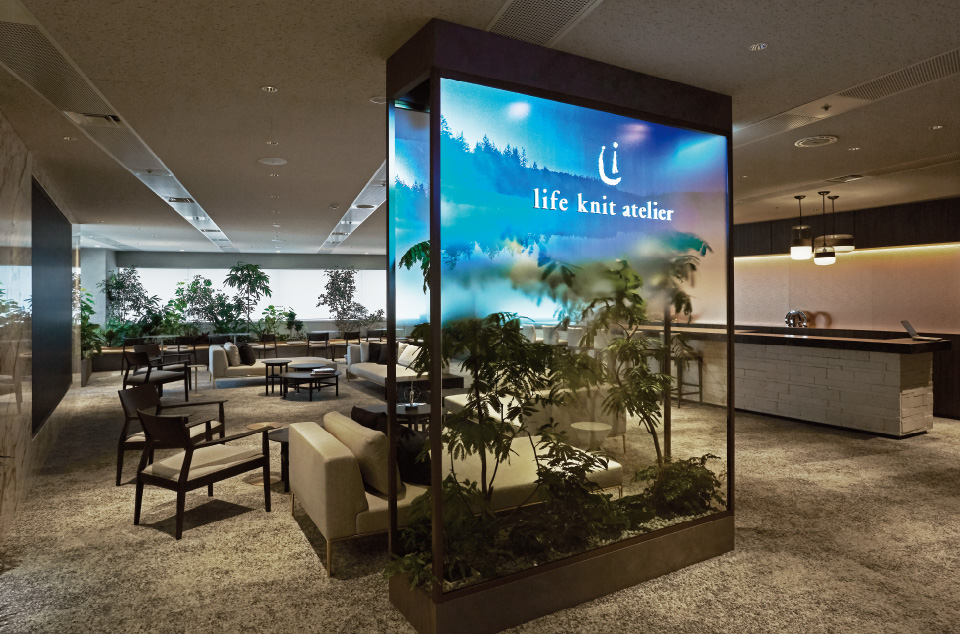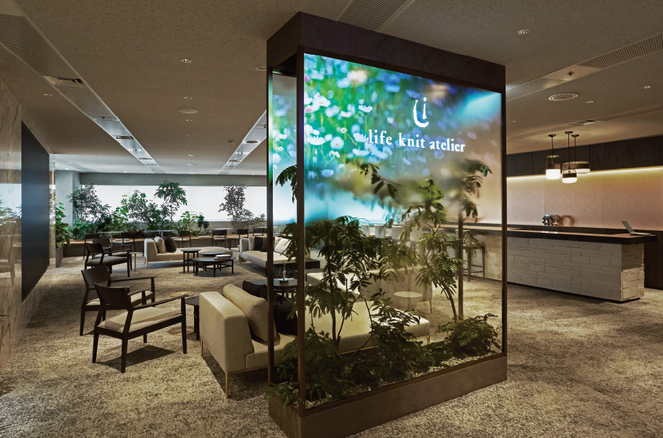 JR船橋駅と京成船橋駅に直結する船橋フェイスが竣工した2003年、その13階に開設されたのが積水ハウス京葉支店で、住宅のショールームでもあった。その後、顧客の価値観や感性の変化に対応するため、全面改修されたのがlife knit atelier。従来は和風・洋風・モダンといった流行のテイスト分類でインテリアを提案していたが、life knit atelierではより普遍的な「静・優・凛・暖・艶・奏」という6つの感性カテゴリーに分類。そこから、住まい手に向けたデザイン提案へと進んでいく。新しいショールームを印象づけるため、エントランスには6つの感性カテゴリーを表現するガラススクリーンが設置されているが、そこにはプロジェクターによって背景映像とロゴマッピングが投影され、スポットライトが植栽を鮮やかに演出。さらに、スポット気流によって植栽にゆらぎを与える、さりげない演出によって自然の要素を感じさせている。