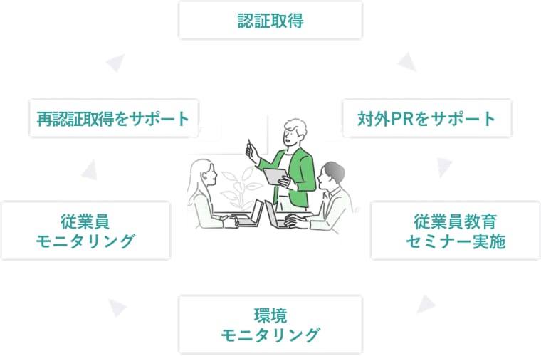 さらに第三者評価チームが実地審査にも対応し、柔軟なスケジュールで認証取得を全面サポートします。