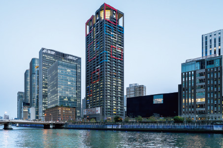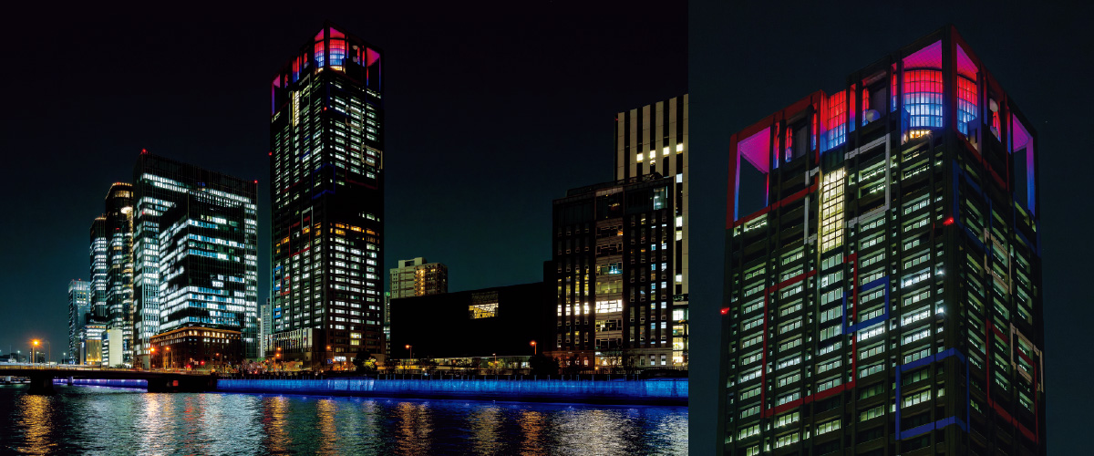 「Liv-Lit」は関電ビルディングの頂上部に設けられたライトアップ設備。時間帯やイベントに応じて変化する動的なカラー演出を行うことで、光による地域の魅力創出や活性化に貢献している。従来の蛍光灯から今回のLED化への更新により、省電力と長寿命化を図りつつ、既存点灯パターンを継承しつつ、より多彩な演出を可能にした。採用されたのは特注シームレス建築化照明器具「C-Slim」。シミュレーションには「ライトニングフロー」を用いることで色や動きなど演出イメージを確認して関係者と合意形成を行った。工事期間中の演出設定時にはPCからライトニングフローによるリモート操作でDMX遠隔制御を行うことにより、リアルタイムの演出調整要望にも対応している。