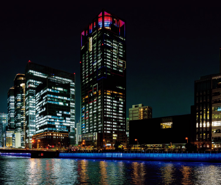 LED化された関電ビルディング(高さ約195m)頂上部の「Liv-Lit」
