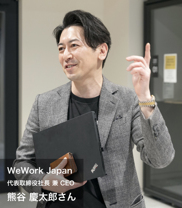 西濱今回は2025年2月にオープンしたばかりのWeWork 赤坂グリーンクロスにやって来ました。首相官邸が目の前にあり、日本の中枢って感じです。まずは、ここを運営されているWeWork の日本法人、WWJ株式会社(WeWork Japan)の代表取締役社長 兼 CEOである熊谷 慶太郎さん。WeWorkの概要や赤坂グリーンクロスの特長などについてお話しいただけますか。