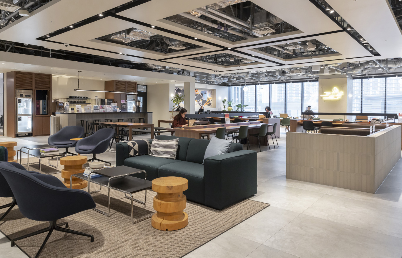 ラウンジの開放的な共有スペース。一般的なオフィスよりも多くのスペースや空間を他の人とシェアする体験に充てる。