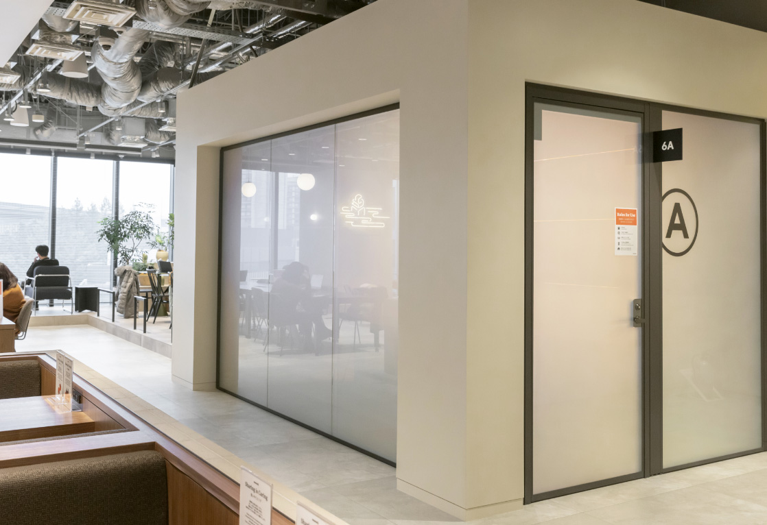 ラウンジにあるミーティングルームの大きな窓には液晶フィルターが組み込まれていて、スイッチひとつで見えなくできる。
