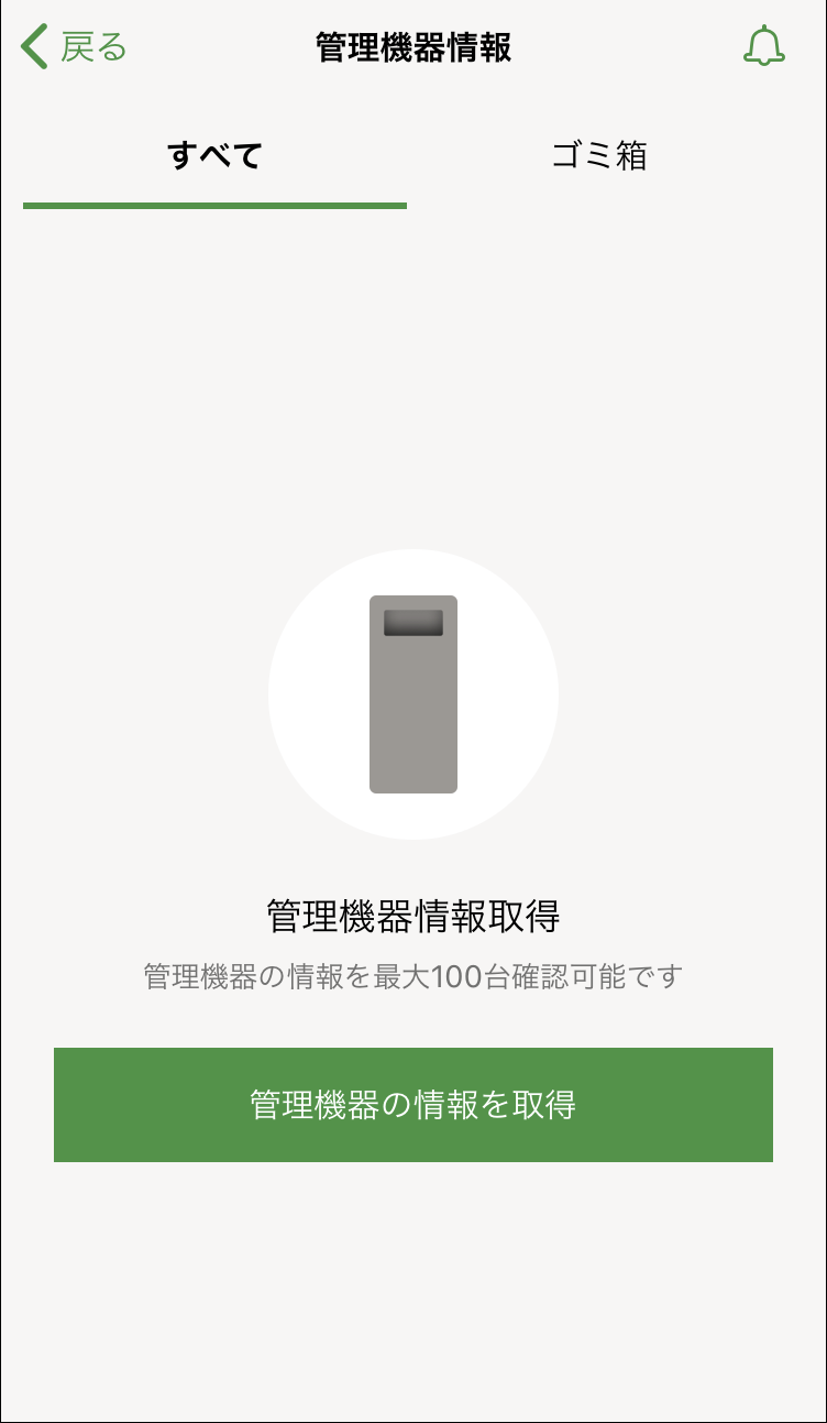 メニューから「管理機器情報取得」を選択したとき、「すべて」と「ゴミ箱」を切替えたときに情報取得画面が表示されます。